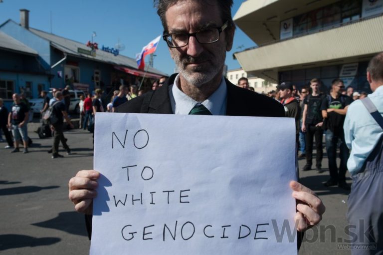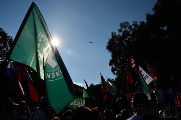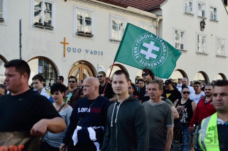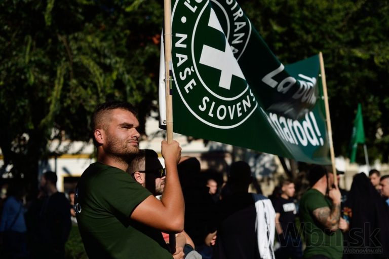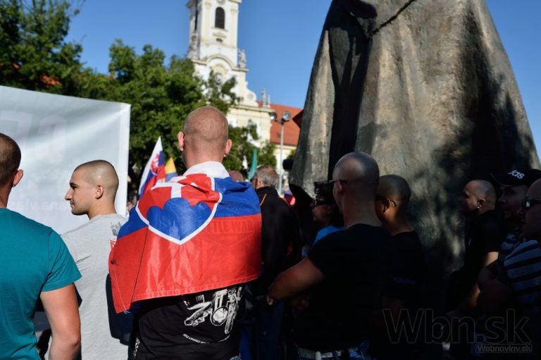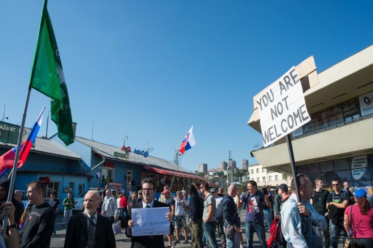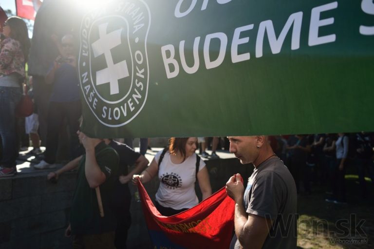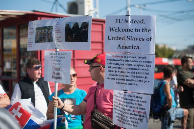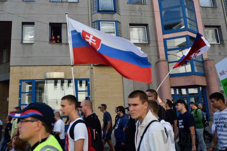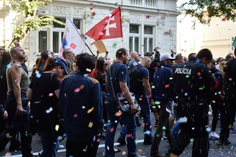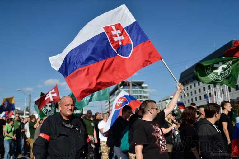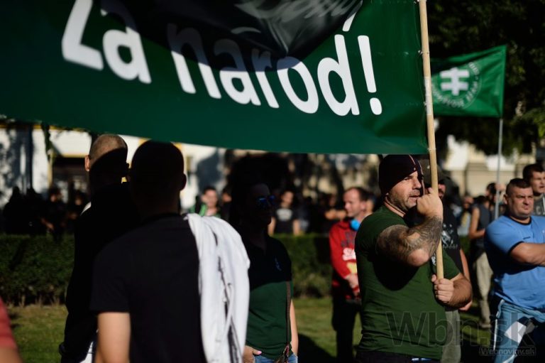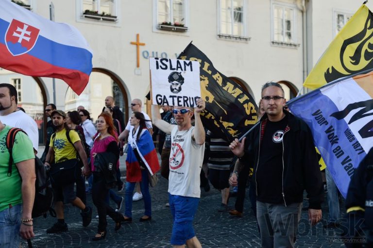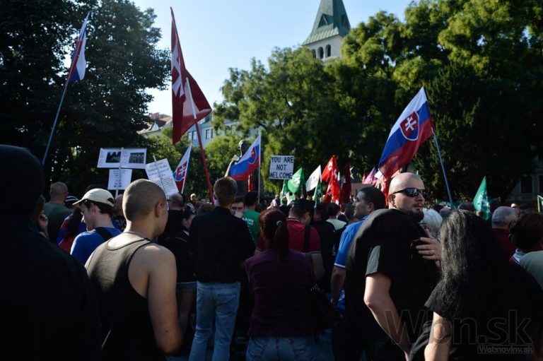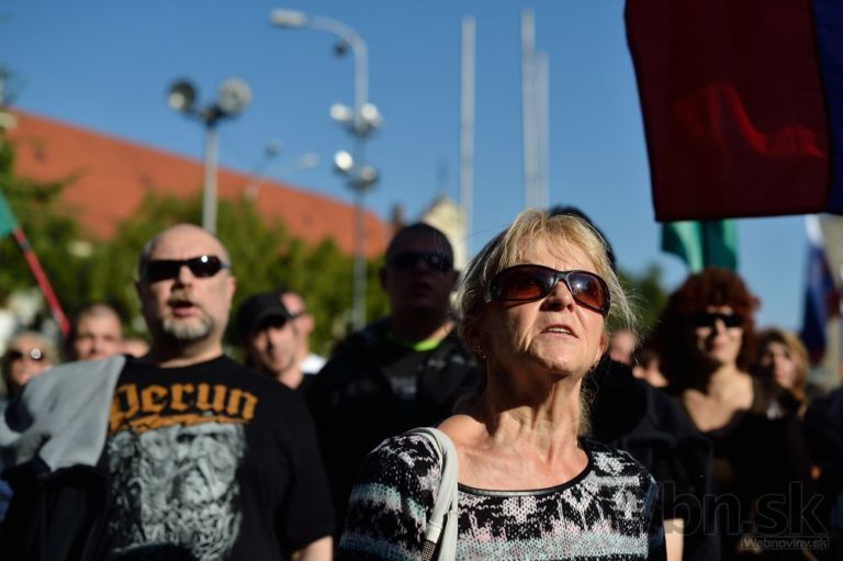 Účastníci počas protestu Spoločne za Slovensko, proti islamizácii Európy a imperializmu USA v Bratislave. Bratislava, 12. september 2015. Foto: SITA/Robert Tappert