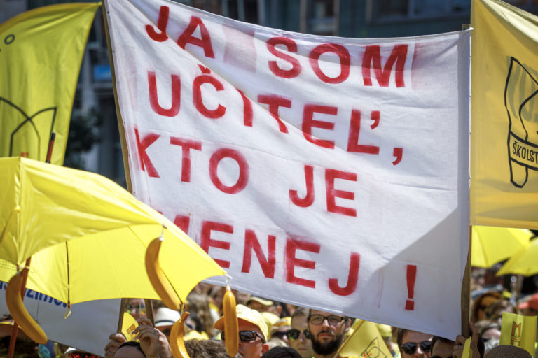 Účastník drží improvizovaný transparent počas protestu Odborového zväzu pracovníkov školstva a vedy na Slovensku na bratislavskom Námestí SNP za vyššie platy zamestnancov a za lepšie podmienky v školách. Foto: ilustračné, SITA/Branislav Bibel