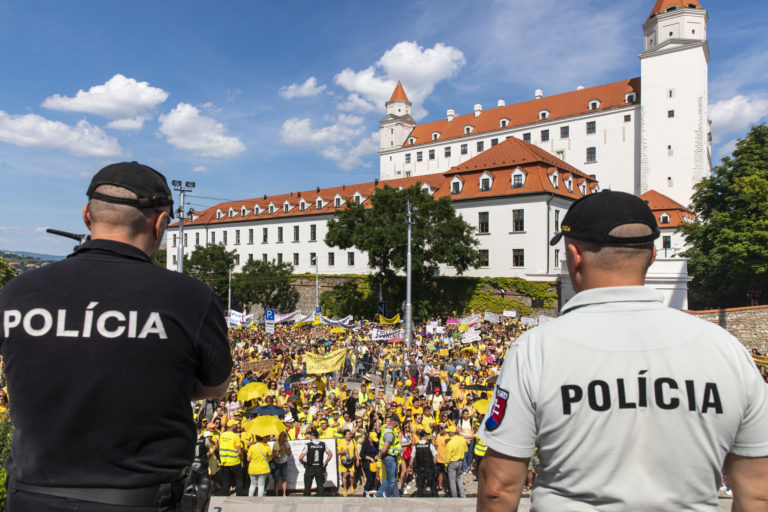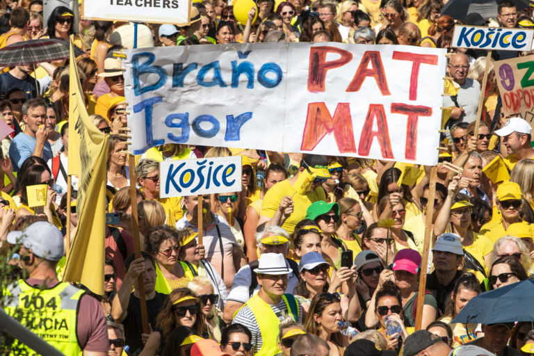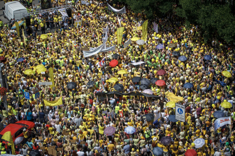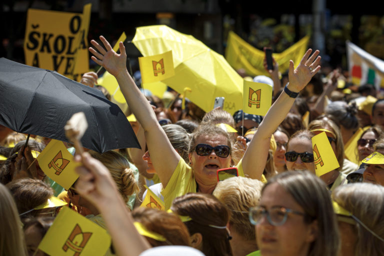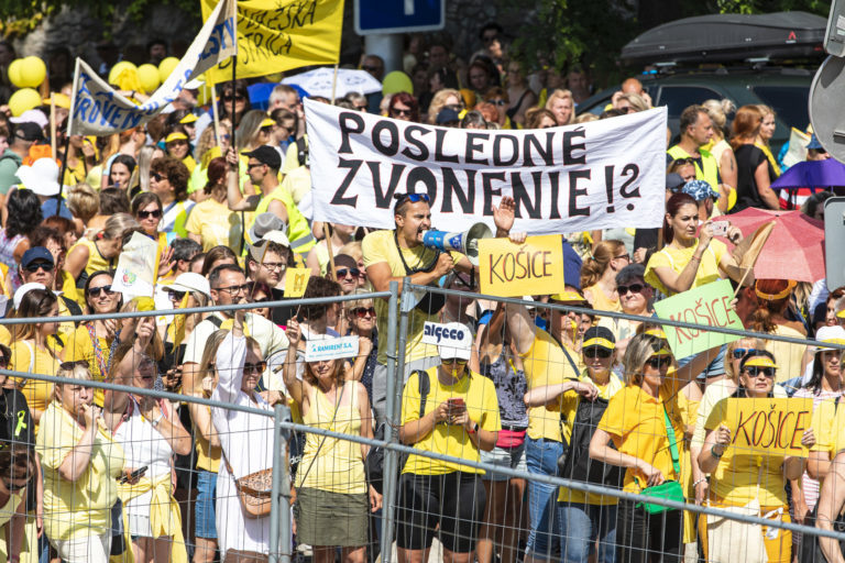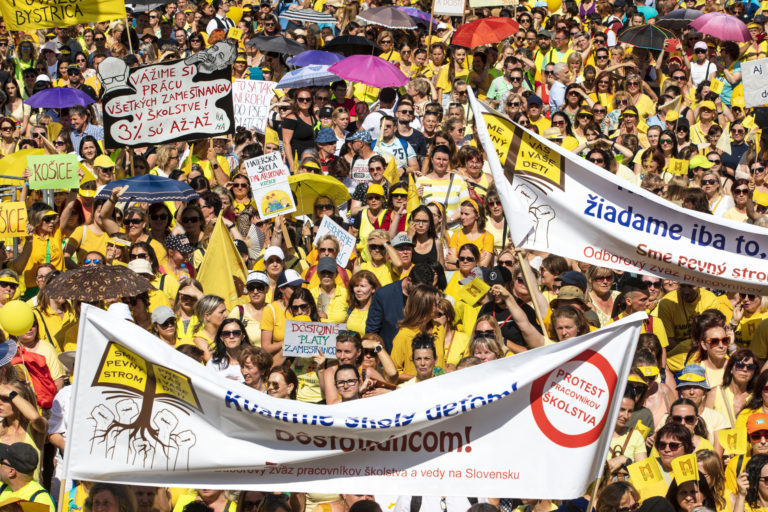 Účastníci v žltých farbách Odborového zväzu pracovníkov školstva a vedy na Slovensku počas protestu za vyššie platy zamestnancov a za lepšie podmienky v školách na bratislavskom Námestí SNP. Foto: SITA/Branislav Bibel
