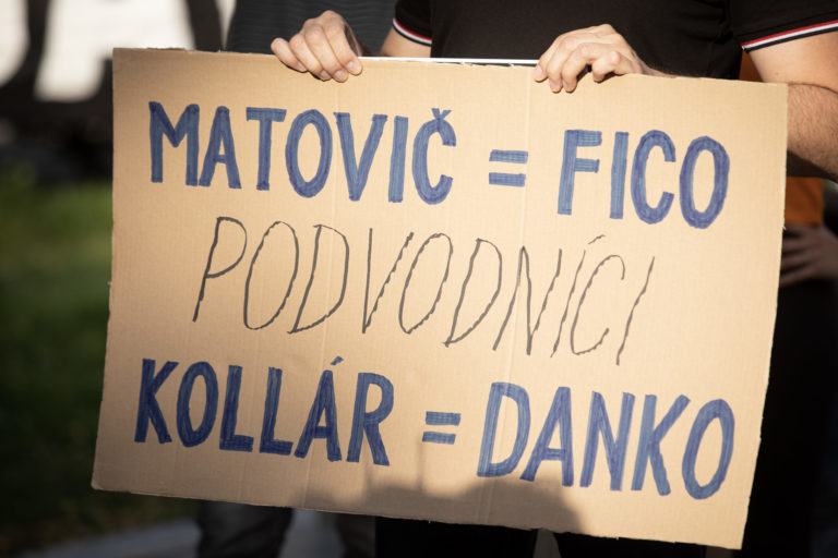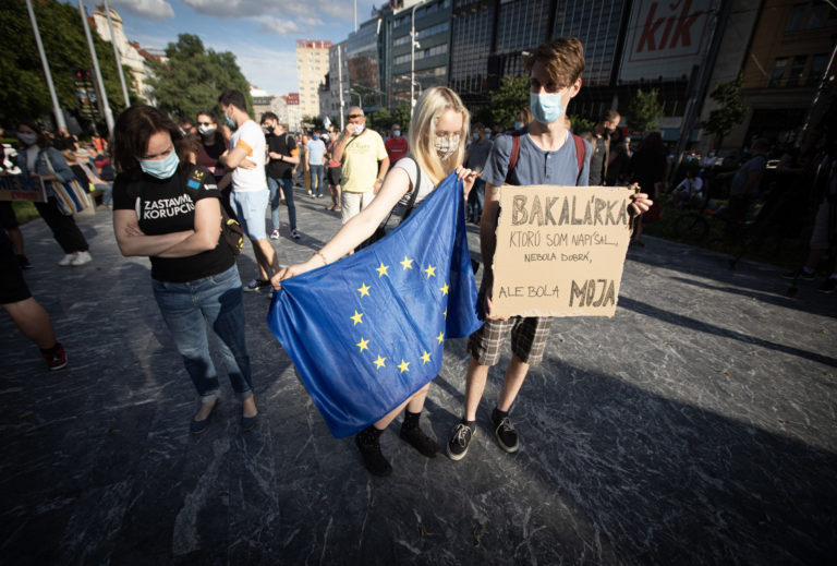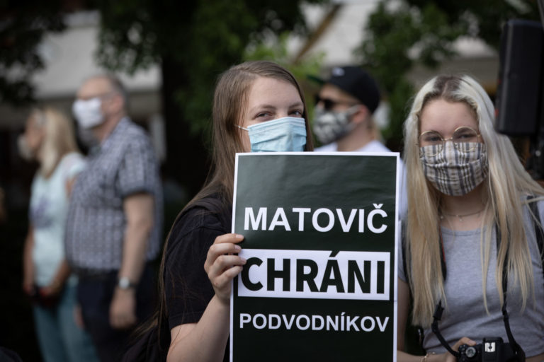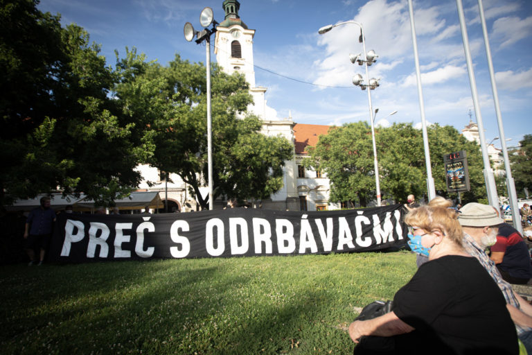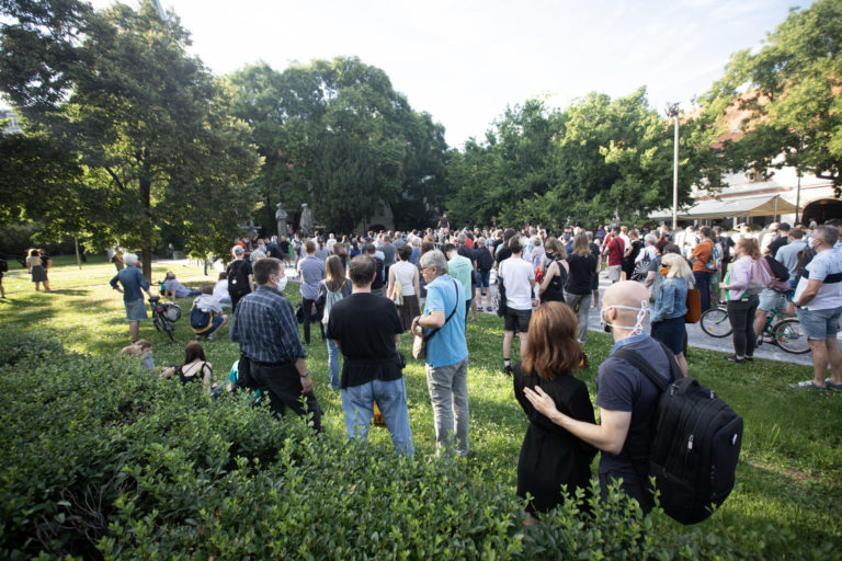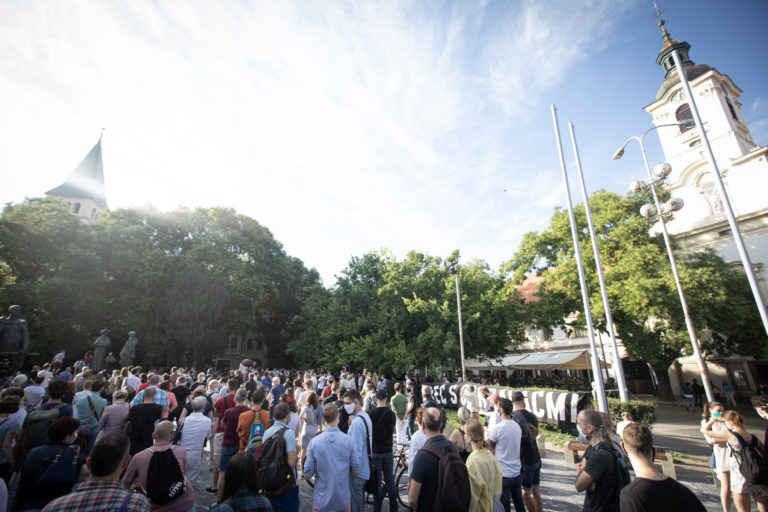 Atmosféra počas protestu Za odpochodovanie plagiátorov z politiky na bratislavskom Námestí SNP, ktorého hlavným organizátorom bola skupina Naše Slovensko. Bratislava, 3. júl 2020. Foto: SITA/Branislav Bibel