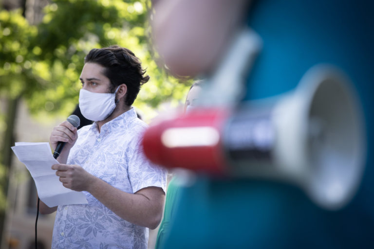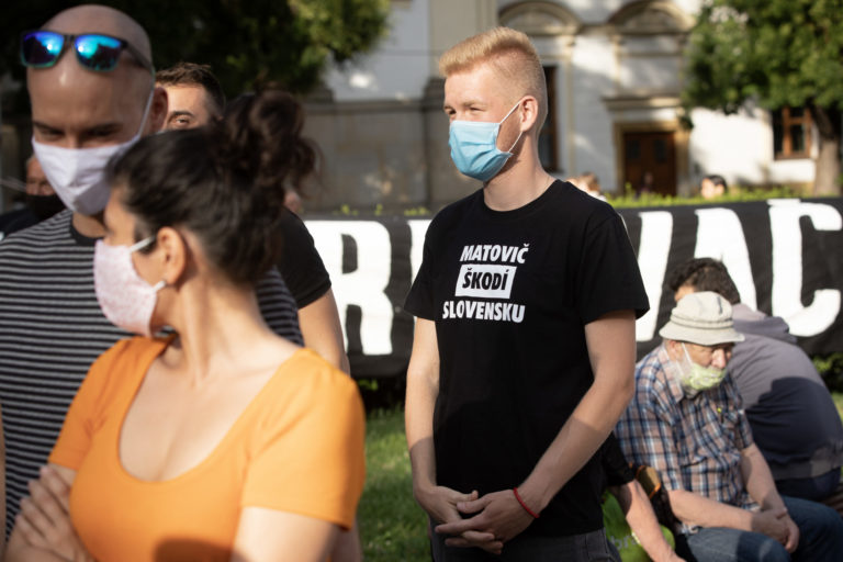 Zástupca Študentskej rady vysokých škôl Matej Bílik počas protestu Za odpochodovanie plagiátorov z politiky na bratislavskom Námestí SNP, ktorého hlavným organizátorom bola skupina Naše Slovensko. Bratislava, 3. júl 2020. Foto: SITA/Branislav Bibel.