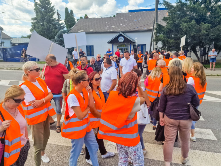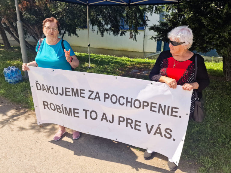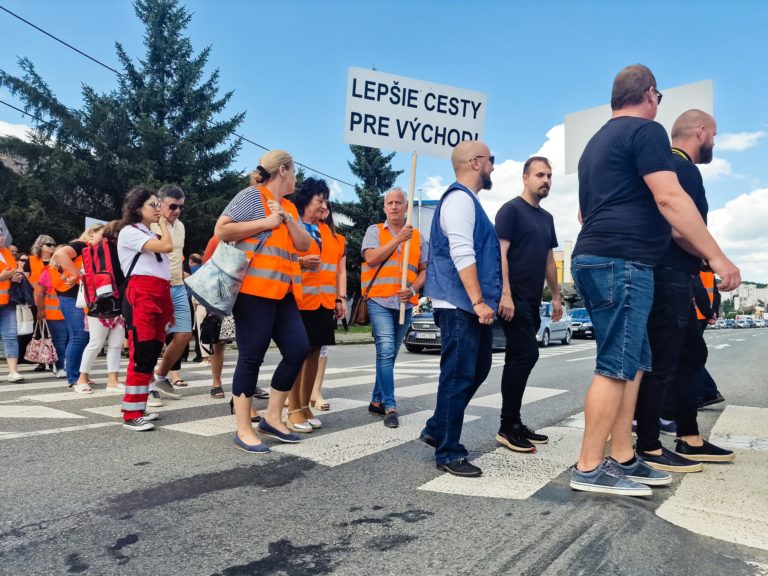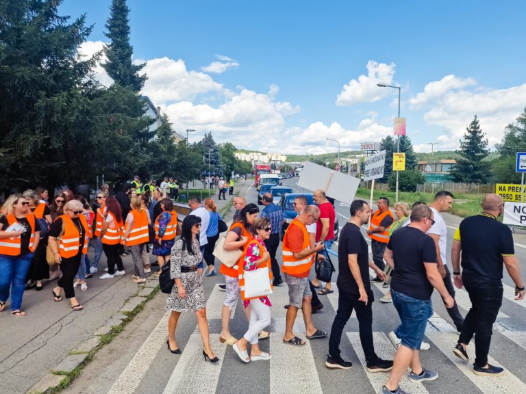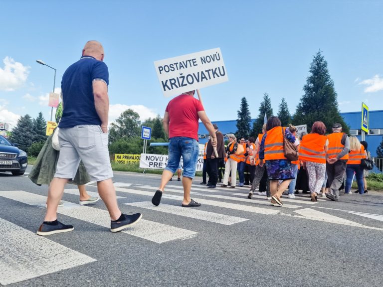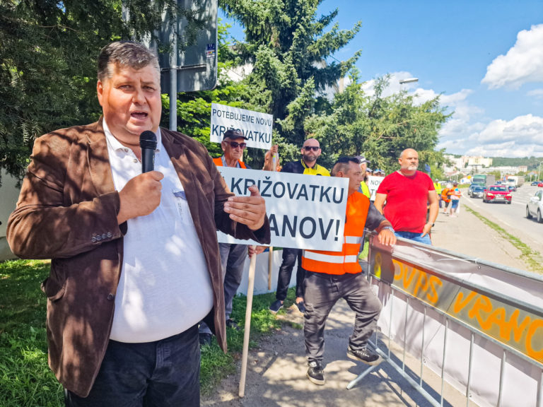 Protestujúci zablokovali dopravu vo Vranove nad Topľou s cieľom vyvinúť tlak na urýchlenú výstavbu križovatky na hlavnom cestnom ťahu mestom. Vranov nad Topľou, 27. júl 2023. Foto: SITA/Ivan Kriššák.