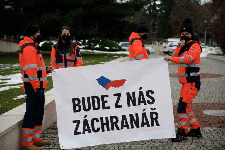Záchranári s transparentom počas poïakovania záchranárov a zdravotníkov poslancom Národnej rady SR a vláde SR za všetko, čo pre nich za posledných dvoch rokov urobili. Poïakovanie sa uskutočnilo pred Národnou radou SR z dôvodu neriešenia podmienok záchranárov a neriešenia ich odlivu zo záchraniek a zo Slovenska. Bratislava, 14. december 2021. Foto: SITA/Branislav Bibel