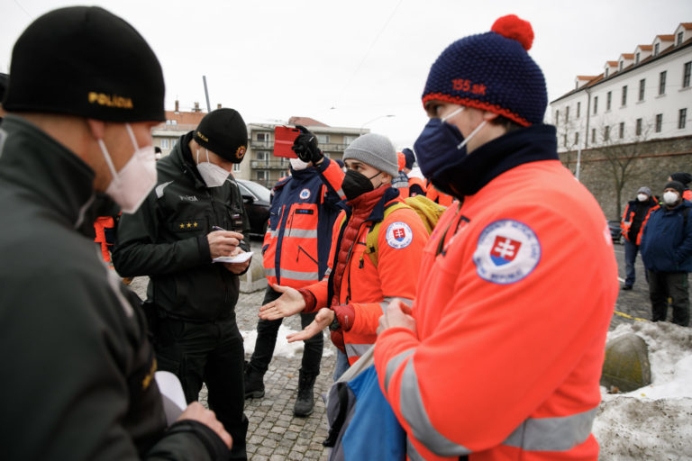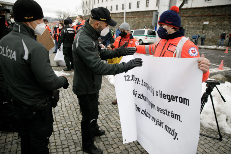 Polícia a členovia Záchrannej zdravotnej služby SR počas poïakovania záchranárov a zdravotníkov poslancom Národnej rady SR a vláde SR za všetko, čo pre nich za posledných dvoch rokov urobili. Poïakovanie sa uskutočnilo pred Národnou radou SR z dôvodu neriešenia podmienok záchranárov a neriešenia ich odlivu zo záchraniek a zo Slovenska. Bratislava, 14. december 2021. Foto: SITA/Branislav Bibel