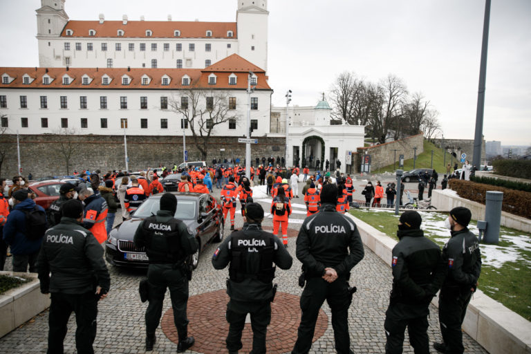 Polícia a členovia Záchrannej zdravotnej služby počas poïakovania záchranárov a zdravotníkov poslancom Národnej rady SR a vláde SR za všetko, čo pre nich za posledných dvoch rokov urobili. Poïakovanie sa uskutočnilo pred Národnou radou SR z dôvodu neriešenia podmienok záchranárov a neriešenia ich odlivu zo záchraniek a zo Slovenska. Bratislava, 14. december 2021. Foto: SITA/Branislav Bibel