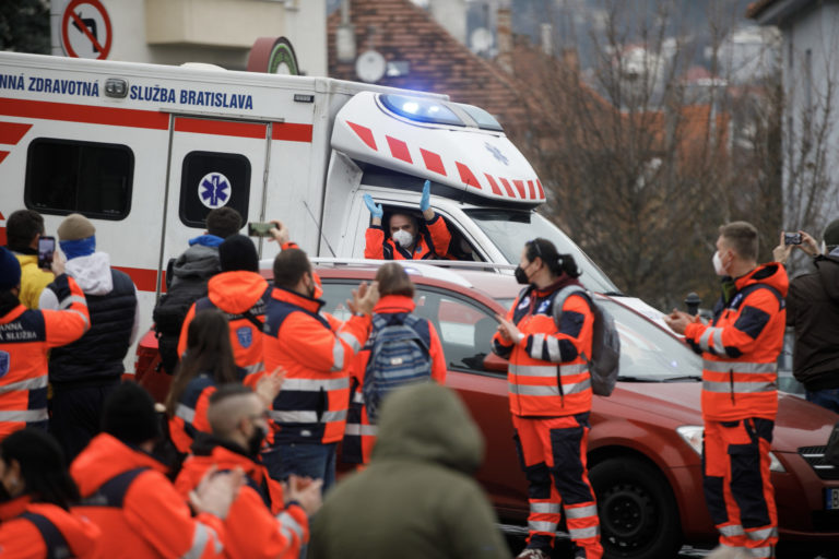 Záchranní zdravotná služba s posádkou počas jazdy v sanitke pri budove NR SR v rámci poïakovania záchranárov a zdravotníkov poslancom Národnej rady SR a vláde SR za všetko, čo pre nich za posledných dvoch rokov urobili. Poïakovanie sa uskutočnilo pred Národnou radou SR z dôvodu neriešenia podmienok záchranárov a neriešenia ich odlivu zo záchraniek a zo Slovenska. Bratislava, 14. december 2021. Foto: SITA/Branislav Bibel
