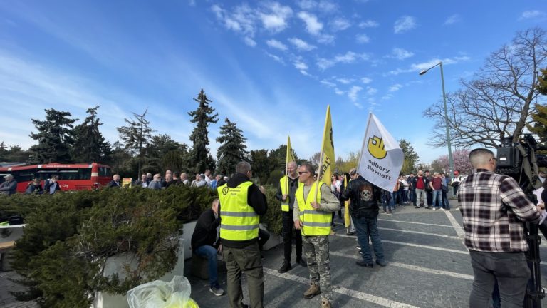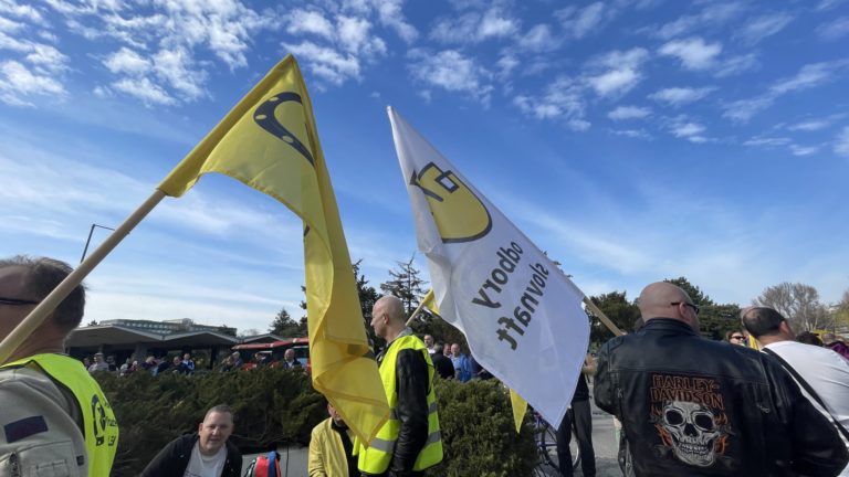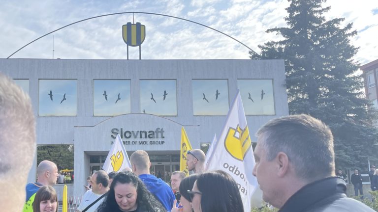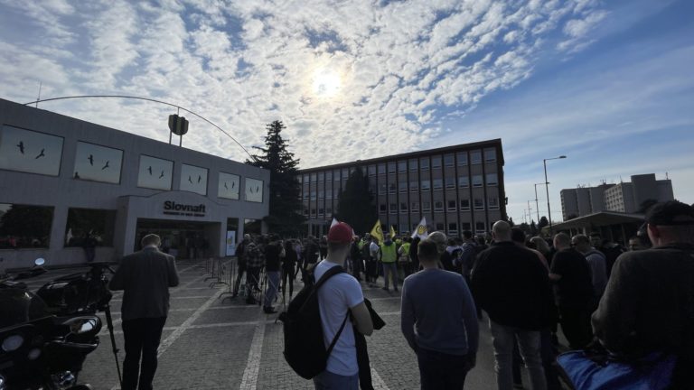 Účastníci protestného zhromaždenia zamestnancov spoločnosti Slovnaft, ktoré sa konalo pred hlavnou vrátnicou Slovnaftu na základe extrémne nízkeho návrhu zamestnávateľa na zvýšenie platov zamestnancov. Bratislava, 23. marec 2023. Foto: SITA/Diana Černáková