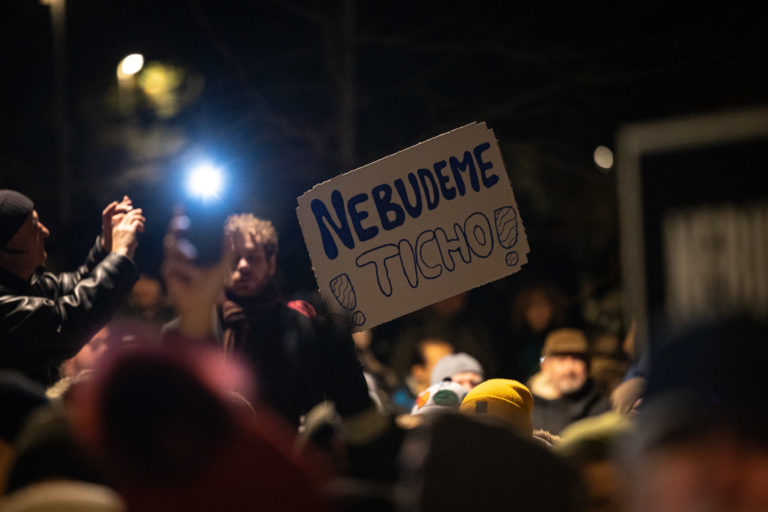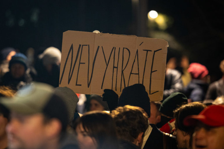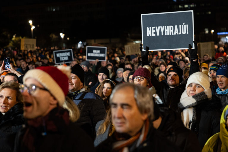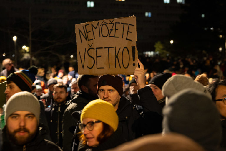 Účastníci počas protestu hnutia Progresívne Slovensko (PS), strany Sloboda a Solidarita (SaS) a Kredsťanskodemokraticého hnutia (KDH) s názvom Zastavme ich! pred Úradom vlády SR. Bratislava, 7. december 2023. Foto: SITA/Jana Birošová