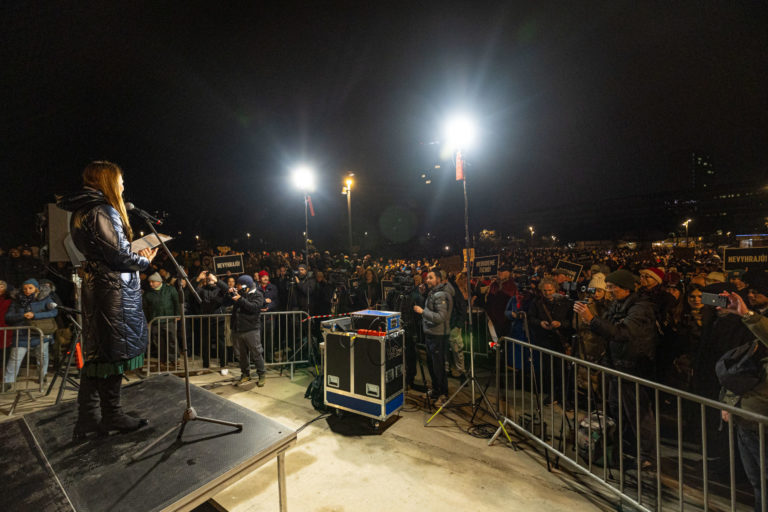 Predseda hnutia Progresívne Slovensko Michal Šimečka počas protestu hnutia Progresívne Slovensko (PS), strany Sloboda a Solidarita (SaS) a Kredsťanskodemokraticého hnutia (KDH) s názvom Zastavme ich! pred Úradom vlády SR. Bratislava, 7. december 2023. Foto: SITA/Jana Birošová