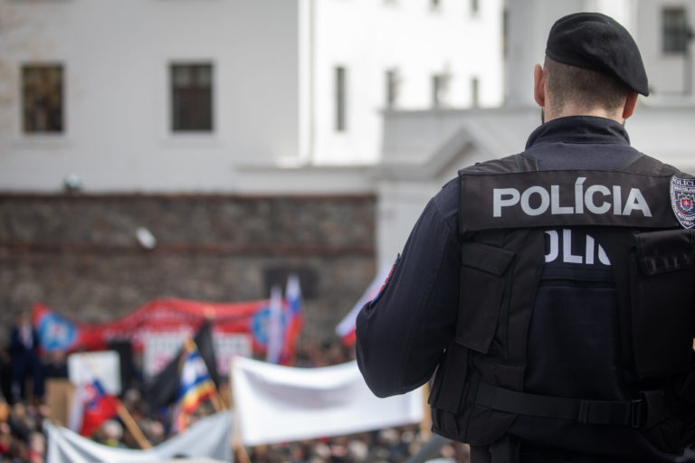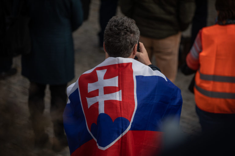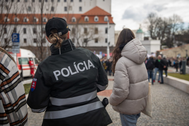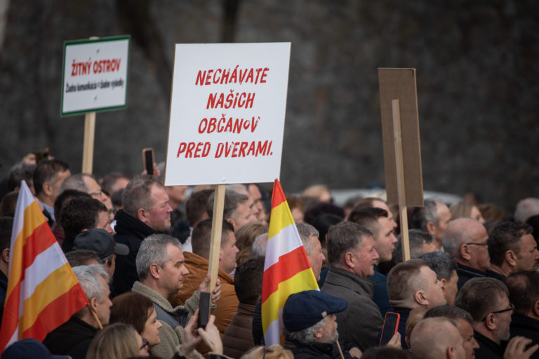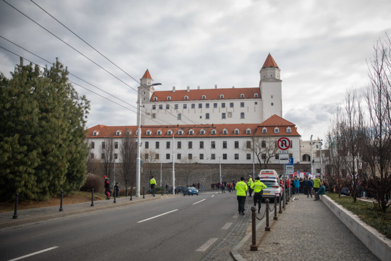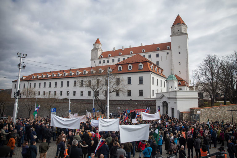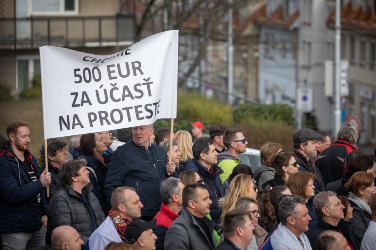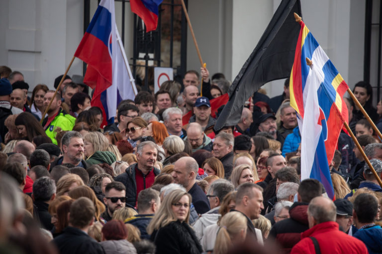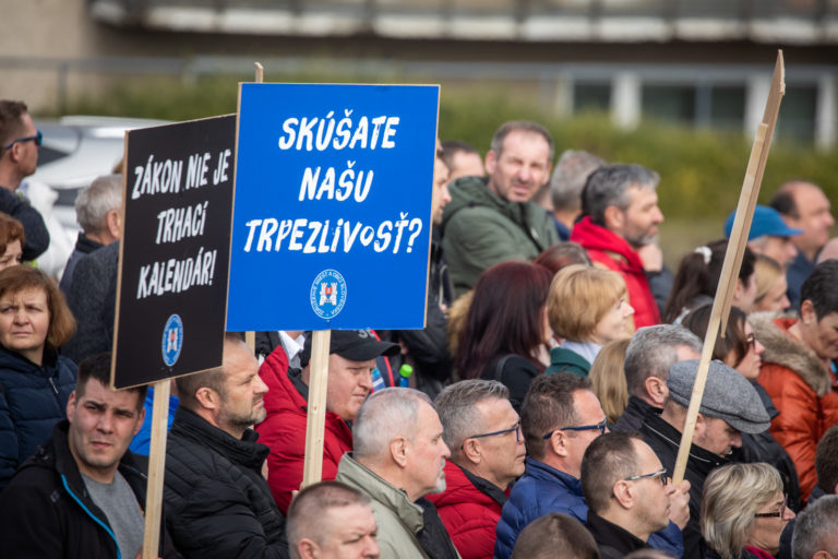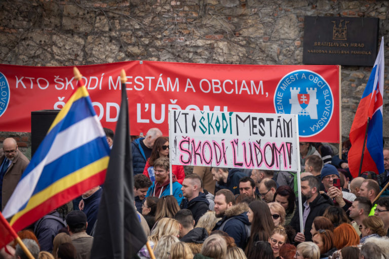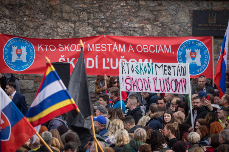 Účastníci protestu s názvom Kto škodí mestám a obciam, škodí ľudom!, ktorý organizovalo Združenie miest a obcí Slovenska (ZMOS) pred Národnou radou SR. Protestom chcú upozorniť na neriešené problémy s vysokými cenami energií a na neadekvátny prístup centrálnej moci voči samosprávam. Bratislava, 22. február 2023. Foto: SITA/Diana Černáková