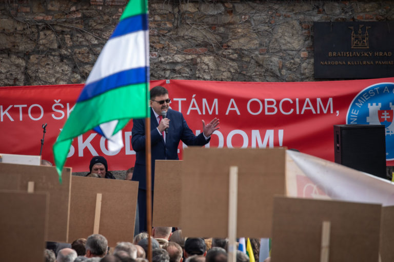 Podpredseda ZMOS a predseda komory miest Jozef Božik (vľavo hore) počas protestu s názvom Kto škodí mestám a obciam, škodí ľuďom!, ktorý organizovalo Združenie miest a obcí Slovenska (ZMOS) pred Národnou radou SR. Protestom chcú upozorniť na neriešené problémy s vysokými cenami energií a na neadekvátny prístup centrálnej moci voči samosprávam. Bratislava, 22. február 2023. Foto: SITA/Diana Černáková