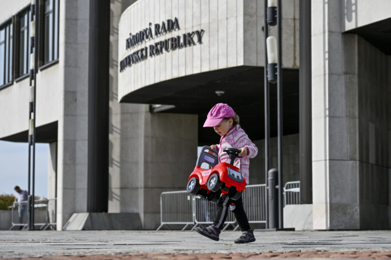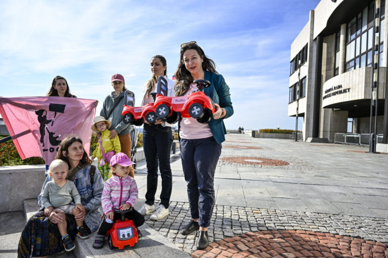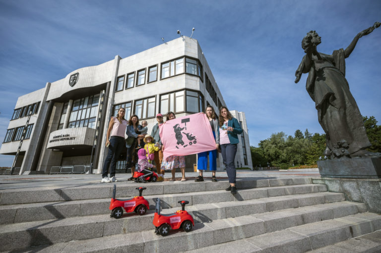 Atmosféra počas happeningu občianskeho združenia (OZ) Znepokojené matky pred budovou Národnej rady SR na tému: Štvorkolkový zákon - vláda má chrániť ľudí pred klimatickou krízou, nie štátnych tajomníkov, ktorí sa chcú hrať. Bratislava, 11. september 2024. Foto: SITA/Milan Illík