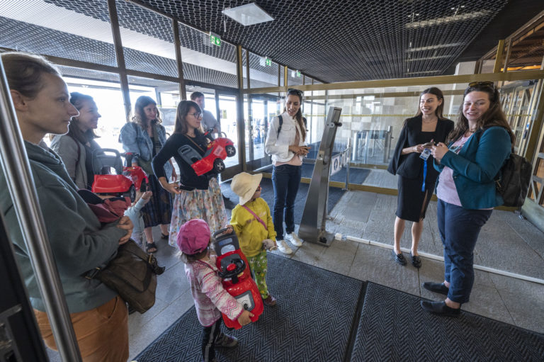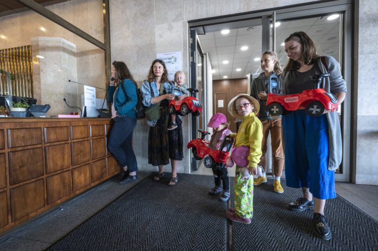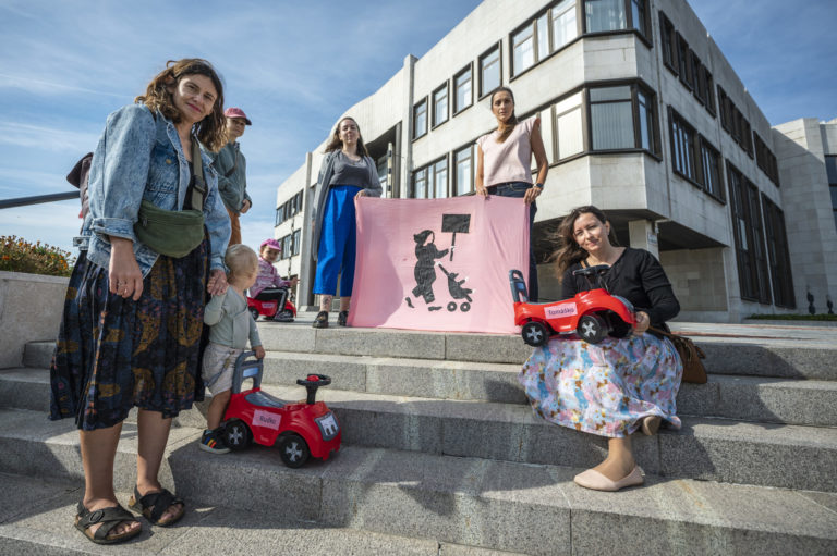 Atmosféra počas odovzdávania štvorkoliek do podateľne NR SR v rámci happeningu občianskeho združenia Znepokojené matky pred Národnou radou (NR) SR na tému: Štvorkolkový zákon - vláda má chrániť ľudí pred klimatickou krízou, nie štátnych tajomníkov, ktorí sa chcú hrať. Bratislava, 11. september 2024. Foto: SITA/Milan Illík