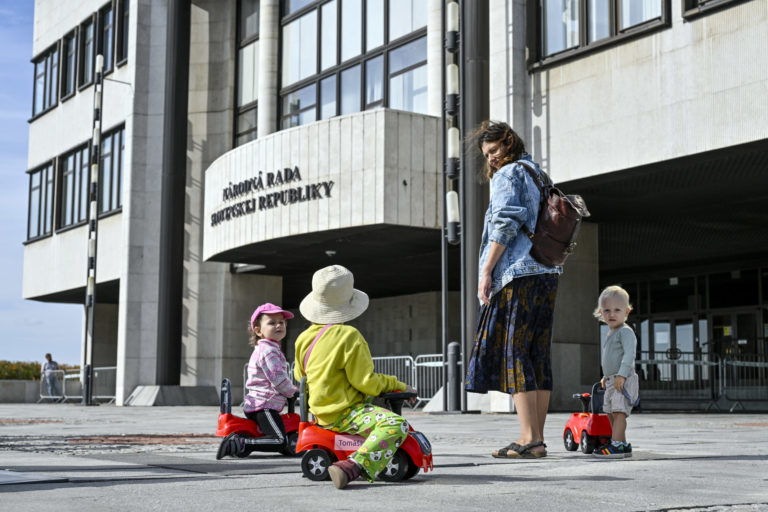 Atmosféra počas happeningu občianskeho združenia Znepokojené matky pred Národnou radou SR na tému: Štvorkolkový zákon - vláda má chrániť ľudí pred klimatickou krízou, nie štátnych tajomníkov, ktorí sa chcú hrať. Bratislava, 11. september 2024. Foto: SITA/Milan Illík