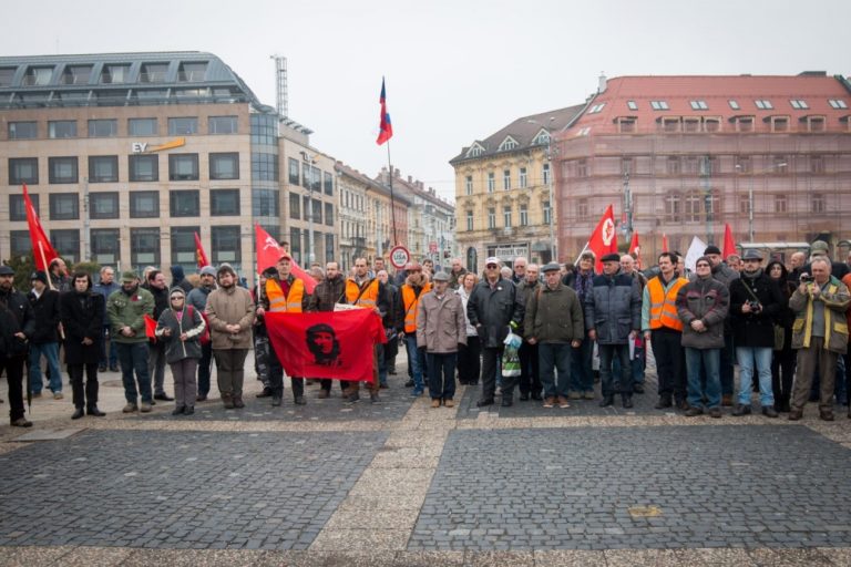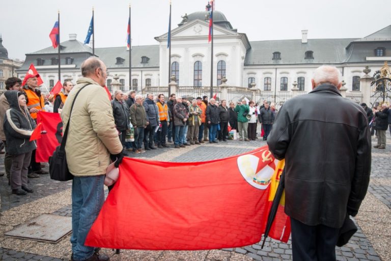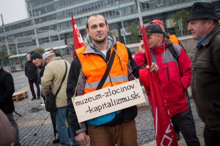 Účastníci počas protestnej demonštrácie, ktorú organizovali: Vzdor - strana práce, Komunistická strana Slovenska, Front ľavicovej mládeže a ďalšie ľavicové a antifašistické organizácie na Hodžovom námestí. Bratislava, 17. november 2016. Foto: SITA/Marek Mrviš