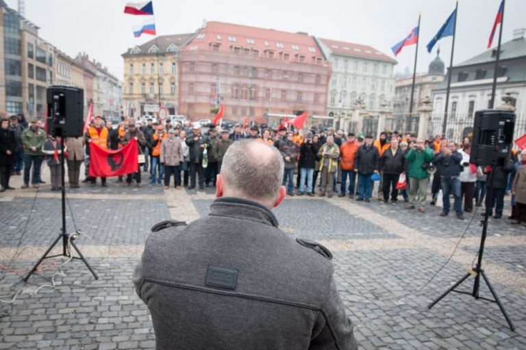 Predseda strany VZDOR – strana práce Stanislav Pirošík (uprostred) počas protestnej demonštrácie, ktorú organizovali: Vzdor - strana práce, Komunistická strana Slovenska, Front ľavicovej mládeže a ďalšie ľavicové a antifašistické organizácie na Hodžovom námestí. Bratislava, 17. november 2016. Foto: SITA/Marek Mrviš