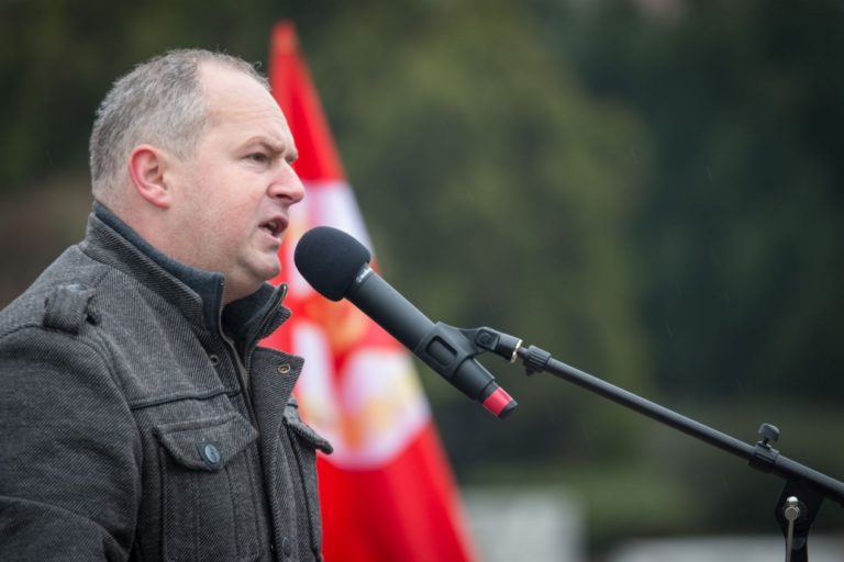 Predseda strany VZDOR – strana práce Stanislav Pirošík počas protestnej demonštrácie, ktorú organizovali: Vzdor - strana práce, Komunistická strana Slovenska, Front ľavicovej mládeže a ďalšie ľavicové a antifašistické organizácie na Hodžovom námestí. Bratislava, 17. november 2016. Foto: SITA/Marek Mrviš