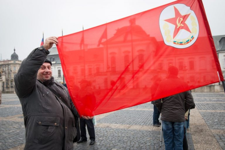Účastník počas protestnej demonštrácie, ktorú organizovali: Vzdor - strana práce, Komunistická strana Slovenska, Front ľavicovej mládeže a ďalšie ľavicové a antifašistické organizácie na Hodžovom námestí. Bratislava, 17. november 2016. Foto: SITA/Marek Mrviš