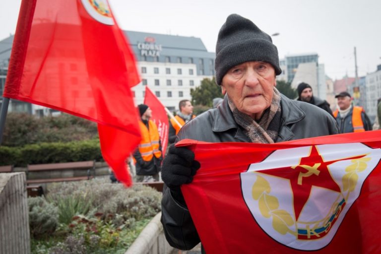 Predseda Komunistickej strany Slovenska Jozef Hrdlička počas protestnej demonštrácie, ktorú organizovali: Vzdor - strana práce, Komunistická strana Slovenska, Front ľavicovej mládeže a ďalšie ľavicové a antifašistické organizácie na Hodžovom námestí. Bratislava, 17. november 2016. Foto: SITA/Marek Mrviš