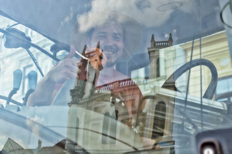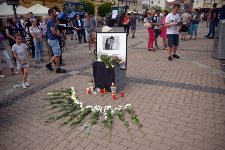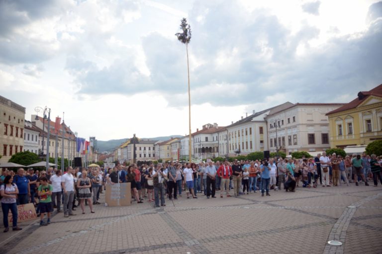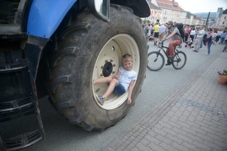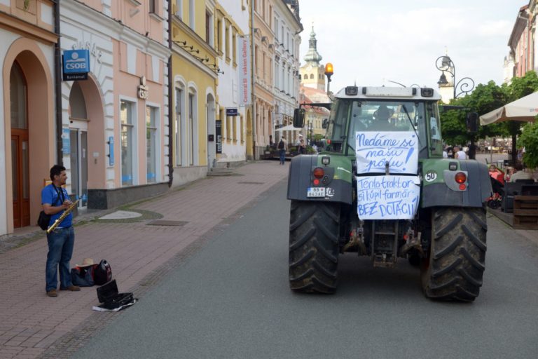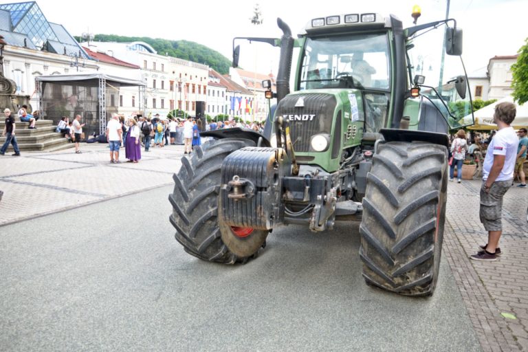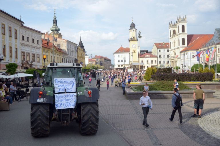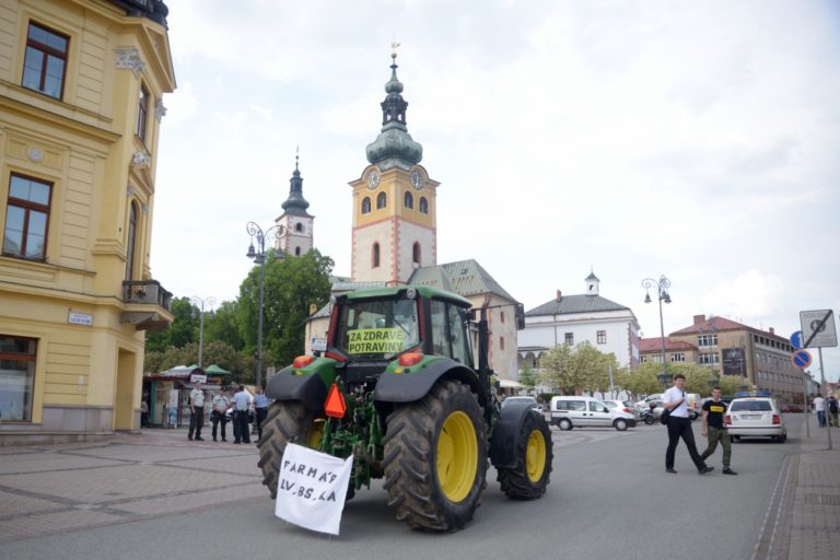 Námestie SNP v Banskej Bystrici počas protestnej jazdy poľnohospodárov organizovanou Občianskym združením Vidiecka platforma, ktorý podporujú aj protest Za slušné Slovensko. Banská Bystrica, 4. máj 2018. Foto: SITA/Jakub Julény