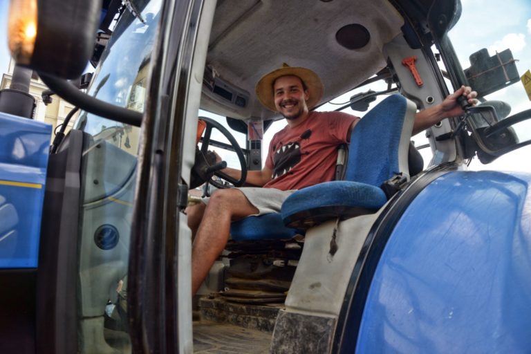 Účastníci s poľnohospodárskou technikou počas protestnej jazdy poľnohospodárov organizovanou Občianskym združením Vidiecka platforma, ktorý podporujú aj protest Za slušné Slovensko. Banská Bystrica, 4. máj 2018. Foto: SITA/Jakub Julény