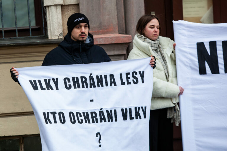 Protestujúci s transparentmi počas spoločnej tlačovej besedy organizácií Aevis, My sme les, WWF Slovensko a Greenpeace Slovensko pred budovou Ministerstva životného prostredia (MŽP) SR v Bratislave na tému: Nestrieľajte vlky. Bratislava, 13. január 2025. Foto: SITA/Tomáš Bokor