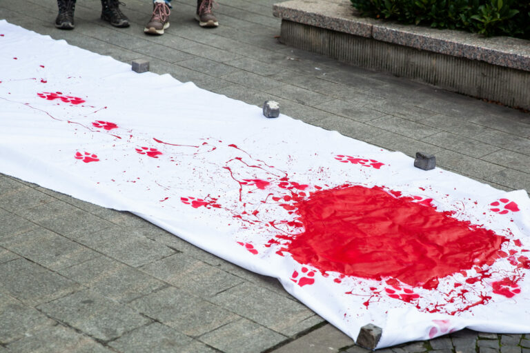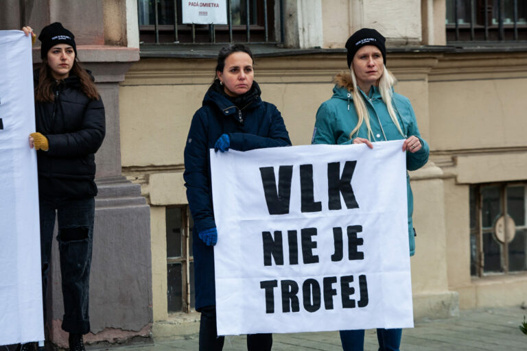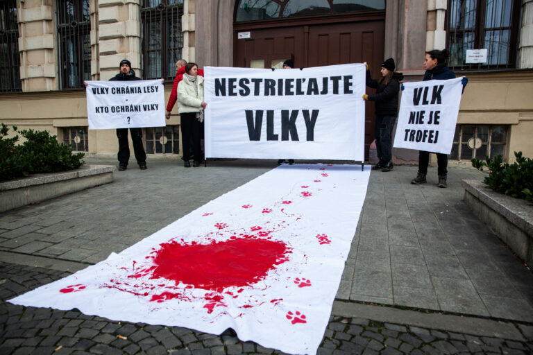 Symbolická vlčia cesta na Ministerstvo životného prostredia (MŽP) SR pre ministra počas spoločnej tlačovej besedy organizácií Aevis, My sme les, WWF Slovensko a Greenpeace Slovensko pred budovou Ministerstva životného prostredia (MŽP) SR v Bratislave na tému: Nestrieľajte vlky. Bratislava, 13. január 2025. Foto: SITA/Tomáš Bokor