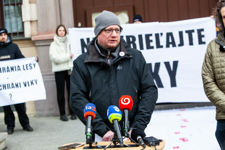 Milan Janák z WWF Slovensko (v popredí) počas spoločnej tlačovej besedy organizácií Aevis, My sme les, WWF Slovensko a Greenpeace Slovensko pred budovou Ministerstva životného prostredia (MŽP) SR v Bratislave na tému: Nestrieľajte vlky. Bratislava, 13. január 2025. Foto: SITA/Tomáš Bokor