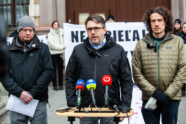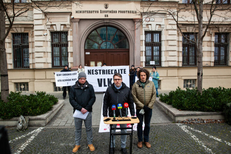 Zľava: Milan Janák z WWF Slovensko, riaditeľ Aevis Rastislav Mičaník a Marek Kuchta z iniciatívy My sme les počas spoločnej tlačovej besedy organizácií Aevis, My sme les, WWF Slovensko a Greenpeace Slovensko pred budovou Ministerstva životného prostredia (MŽP) SR v Bratislave na tému: Nestrieľajte vlky. Bratislava, 13. január 2025. Foto: SITA/Tomáš Bokor