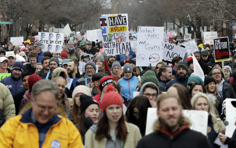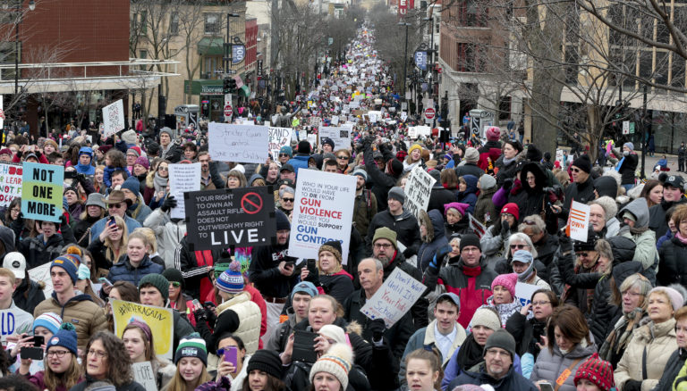 Ulice plné protestujúcich ľudí za lepšiu kontrolu držania zbraní po februárovej streľbe na strednej škole v Parklande, Madison, Wisconsin, 24. marec 2018 Foto: SITA/AP
