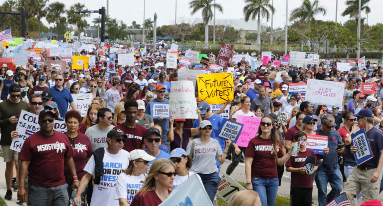 Tisíce ľudí na protestoch v Parklande po februárovej streľbe na strednej škole. Medzi účastníkmi sú aj študenti, ktorí streľbu prežili, Parkland, Florida, 24. marec 2018 Foto: SITA/AP