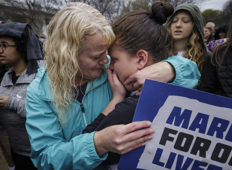 Matka (vľavo) utešuje svoju dcéru po minúte ticha na uctenie si obetí streľby na strednej škole v Parklande, Chattanooga, Tennessee, 24. marec 2018 Foto: SITA/AP