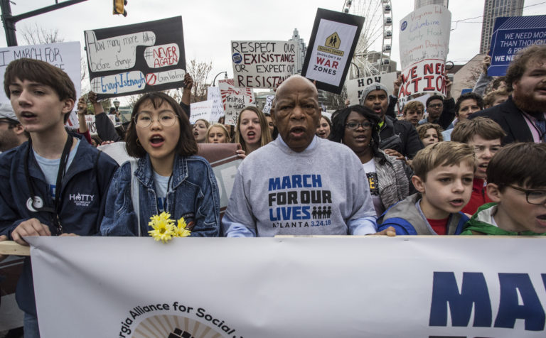 Reprezentant Spojených Štátov, John Lewis, kráča s tisíckami ľudí, ktorí sa zhromaždili na protestoch v Atlante, Atlanta, Georgia, 24. marec 2018 Foto: SITA/AP