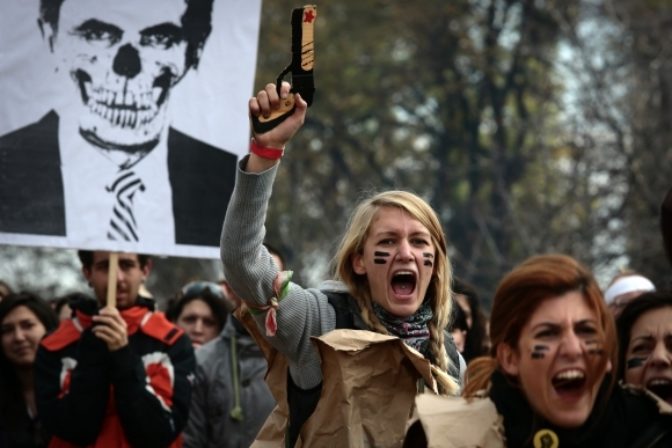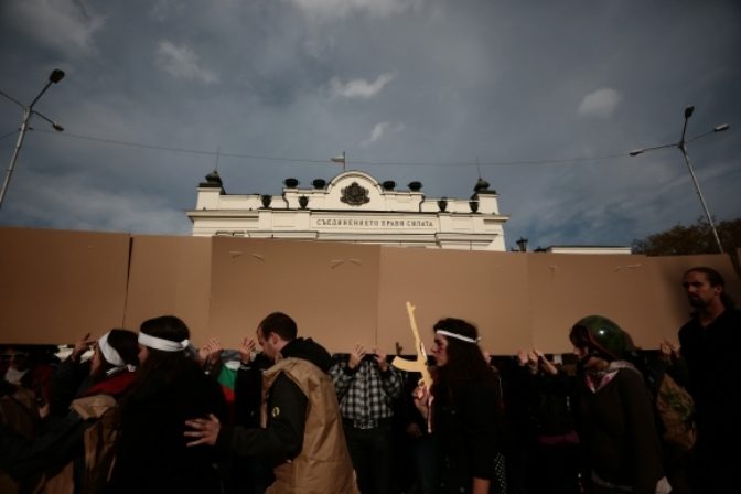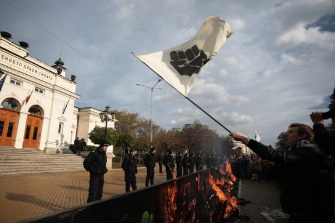 Dav asi tisíc nahnevaných Bulharov s pomocou rôznych potravín zaútočil na sídlo parlamentu v hlavnom meste Sofia. Foto: SITA/AP
