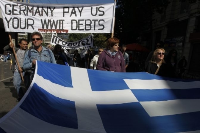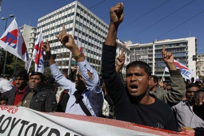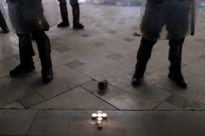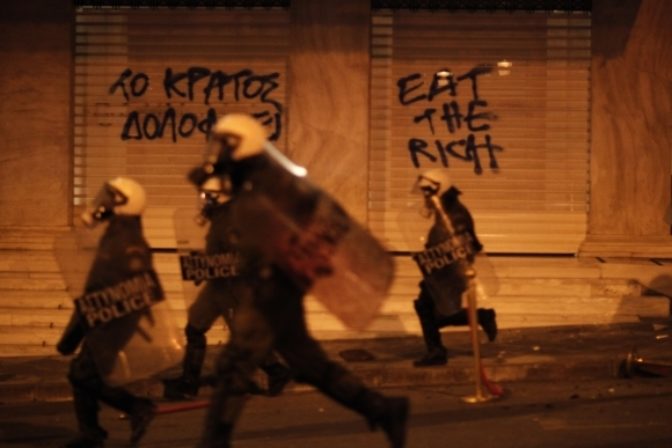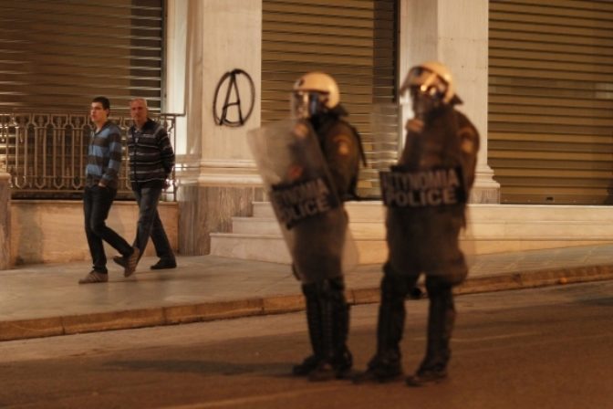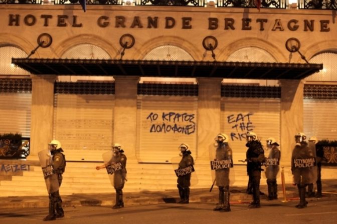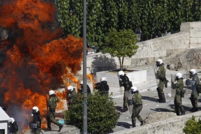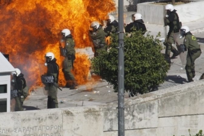 V Aténach sa desaťtisíce ľudí ohradili proti úsporným opatreniam vlády. Úrady len v samotných Aténach zmobilizovali 5000 príslušníkov bezpečnostných zložiek, ktorí tam zasahujú na viacerých miestach. Atény, 23. február 2011. Foto: SITA/AP