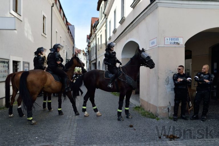 Policajné zložky v centre Žiliny počas pokojného zhromaždenia proti xenofóbii, rasizmu a nenávisti spojené s neformálnou verejnou zbierkou pre organizáciu, ktorá sa venuje práci s utečencami, na Mariánskom námestí. Žilina, 11. júl 2015. Foto: SITA/Robert Tappert