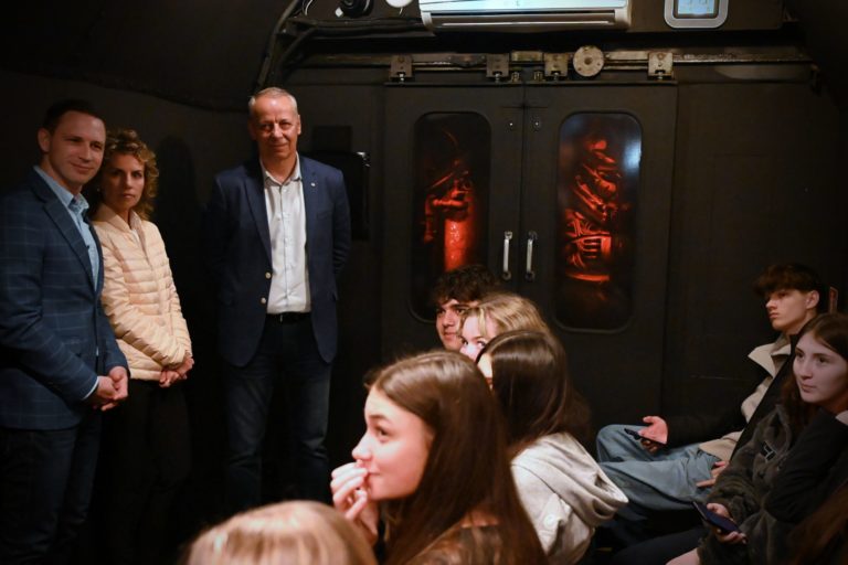 Primátor mesta Banská Bystrica Ján Nosko (tretí zľava) počas prehliadky protidrogového vlaku Revolution train v Banskej Bystrici v rámci prevenčných aktivít zameraných proti sociálno-patologickým javom. Banská Bystrica, 22. apríl 2024. Foto: SITA/Jakub Julény