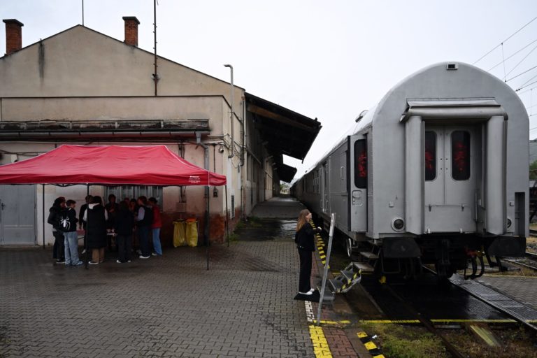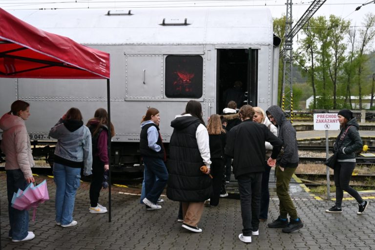 Protidrogový vlak Revolution train v Banskej Bystrici počas jeho prehliadky v rámci prevenčných aktivít zameraných proti sociálno-patologickým javom. Banská Bystrica, 22. apríl 2024. Foto: SITA/Jakub Julény