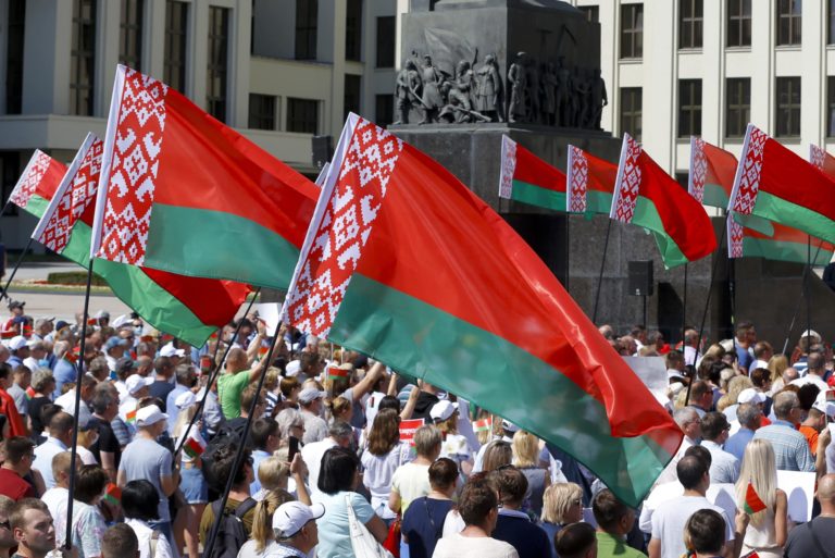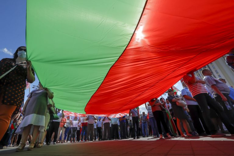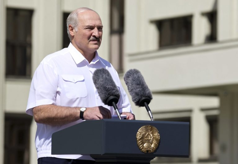Na provládnom proteste vystúpil aj bieloruský prezident Alexander Lukašenko. 16. august 2020 Foto: SITA/AP