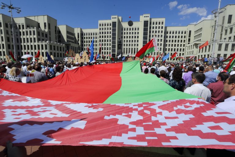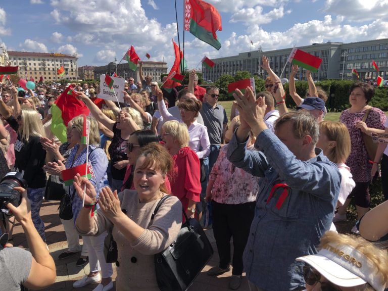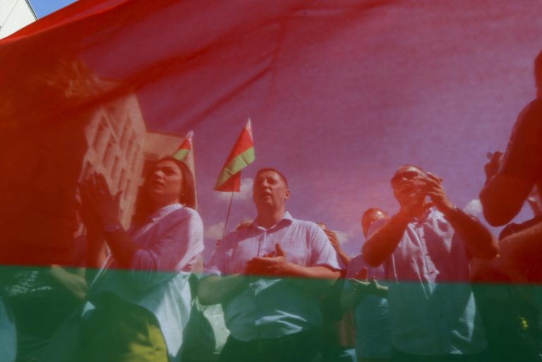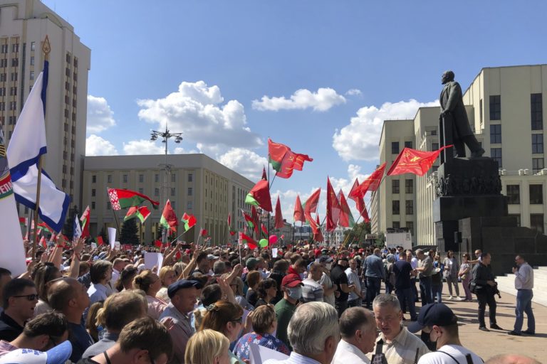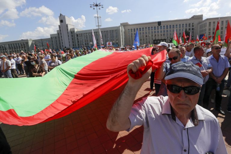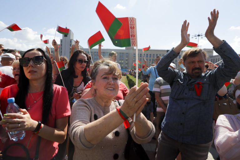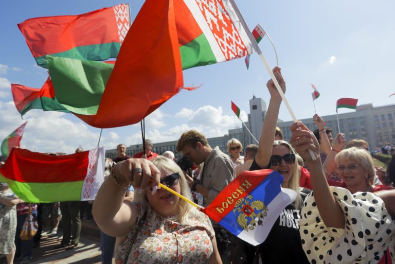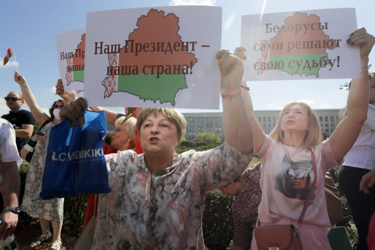 V bieloruskom hlavnom meste sa konalo aj zhromaždenie niekoľko stoviek podporovateľov prezidenta Alexandra Lukašenka. 16. august 2020 Foto: SITA/AP