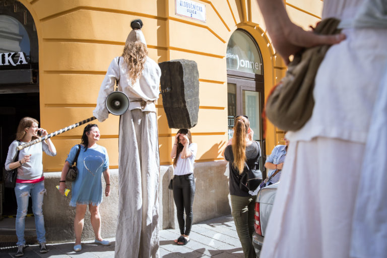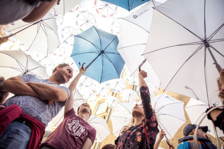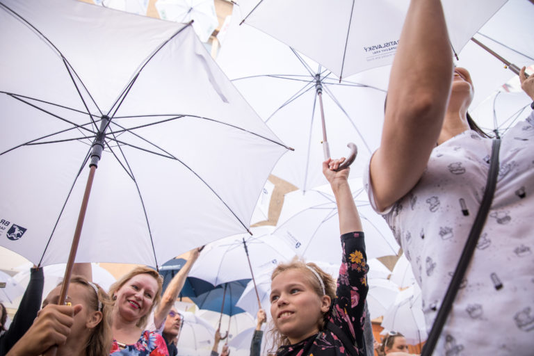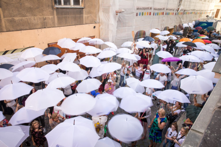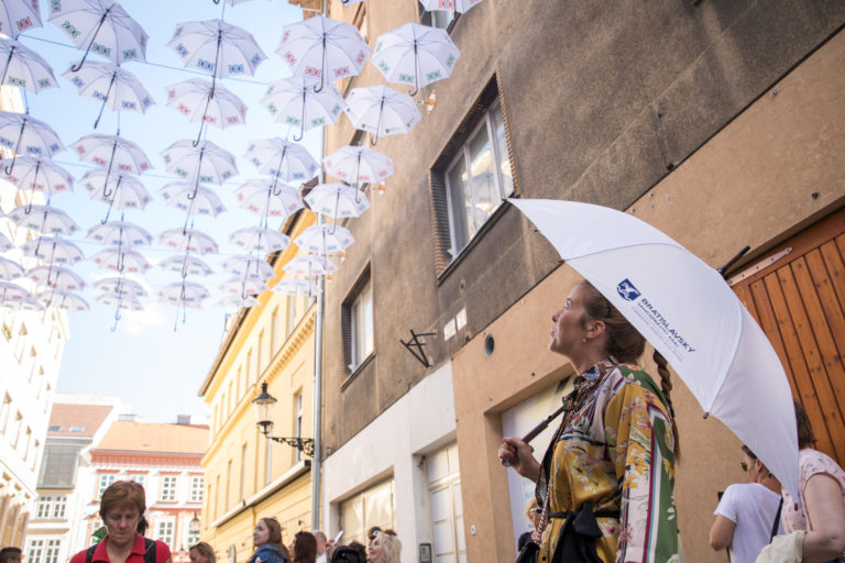 Atmosféra podujatia Dádniková ulica - Umbrella street poèas prekonania rekordu v poète naraz otvorených dádnikov na Nedbalovej ulici pri príleitosti 2. roèníka Urban Art Festivalu. Bratislava, 30. jún 2018. Foto: SITA/Diana Èernáková Foto: SITA/Diana Černáková