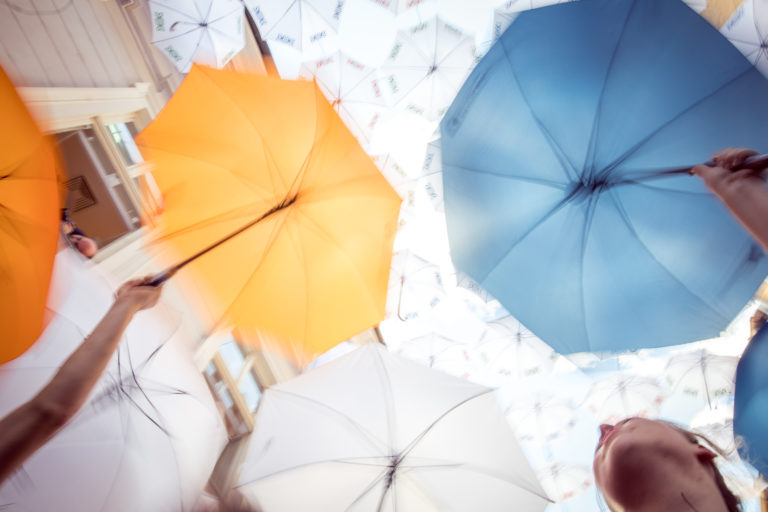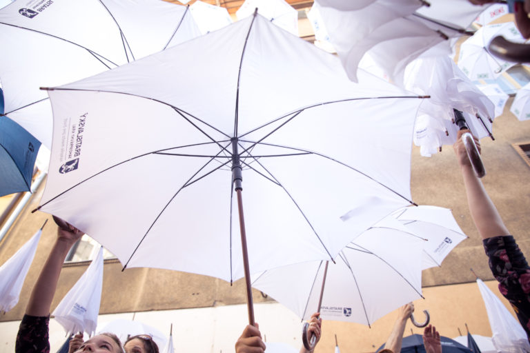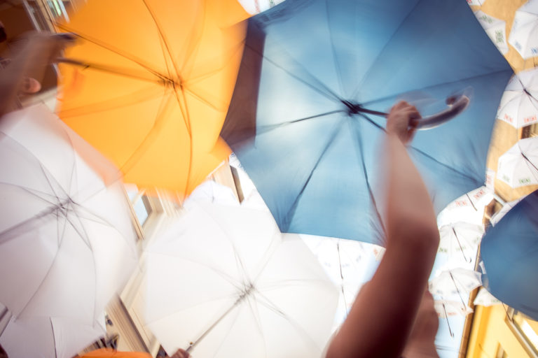 Účastníci podujatia Dáždniková ulica - Umbrella street sa snažia prekonať rekord v počte naraz otvorených dáždnikov na Nedbalovej ulici počas 2. ročníka Urban Art Festivalu. Bratislava, 30. jún 2018. Foto: SITA/Diana Černáková