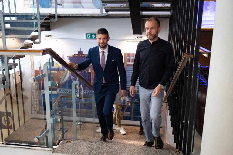 Predseda strany HLAS-SD Peter Pellegrini (vľavo) pred diskusnou reláciou RTVS O 5 minút 12. Bratislava, 1. október 2023. Foto: SITA/Jana Birošová