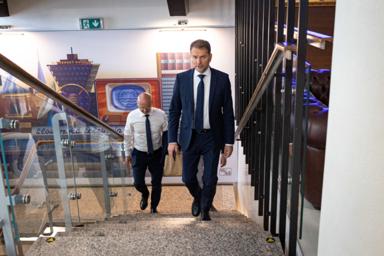 Predseda strany OĽANO Igor Matovič (vpravo) počas príchodu na diskusnú reláciu RTVS O 5 minút 12. Bratislava, 1. október 2023. Foto: SITA/Jana Birošová