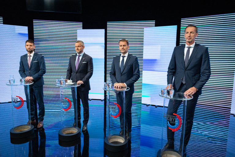 Zľava: Predseda hnutia Progresívne Slovensko Michal Šimečka, predseda strany HLAS-SD Peter Pellegrini, predseda strany OĽANO Igor Matovič a predseda hnutia KDH Milan Majerský počas diskusnej relácie RTVS O 5 minút 12. Bratislava, 1. október 2023. Foto: SITA/Jana Birošová