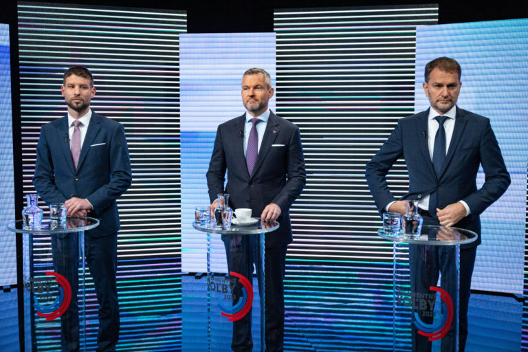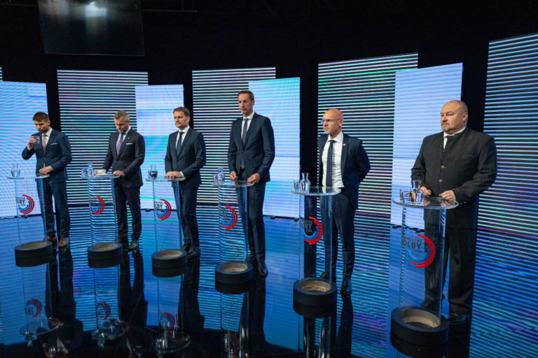 Zľava: Predseda hnutia Progresívne Slovensko Michal Šimečka, predseda strany HLAS-SD Peter Pellegrini, predseda strany OĽANO Igor Matovič, predseda hnutia KDH Milan Majerský, podpredseda strany SaS Branislav Gröhling a predseda strany Národná koalícia Rudolf Huliak počas diskusnej relácie RTVS O 5 minút 12. Bratislava, 1. október 2023. Foto: SITA/Jana Birošová