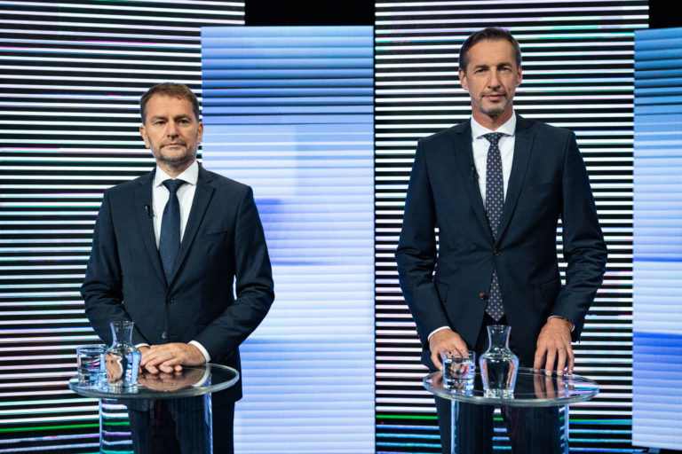 Zľava: predseda strany HLAS-SD Peter Pellegrini a predseda strany OĽANO Igor Matovič v diskusnej relácii RTVS O 5 minút 12. Foto: archívne, SITA/Jana Birošová