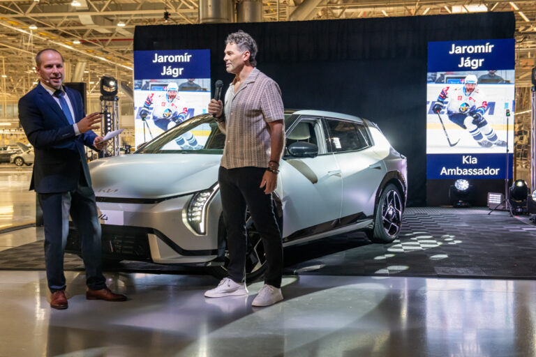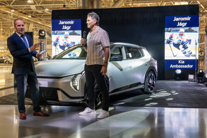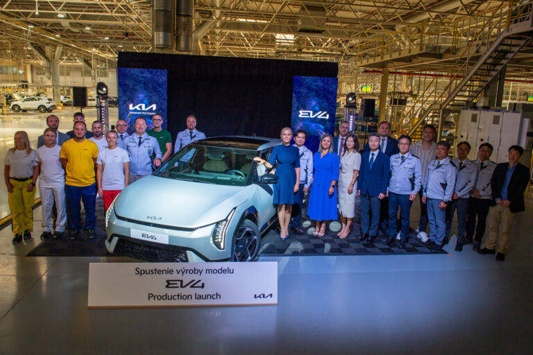 Prvé plne elektrické vozidlo Kia EV4 spustila spoločnosť Kia Slovakia do sériovej výroby 15. augusta 2025 v závode v Tepličke nad Váhom. Päťdverové vozidlá budú vyrábané výlučne v slovenskom závode, predovšetkým pre zákazníkov v Európe. Teplička nad Váhom, 15. august 2025. Foto: SITA/Kia Slovakia