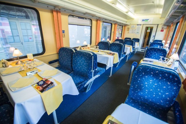 Pohľad do jedálenského vagóna štátneho komerčného IC vlaku. Štátny železničný dopravca obnovil od 11. decembra prevádzku štátnych komerčných IC vlakov. Bratislava, 11. december 2016. Foto: SITA/Marko Erd