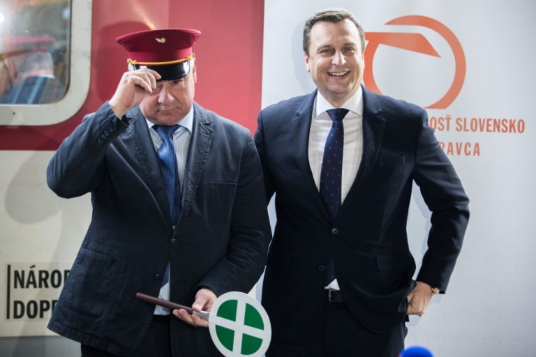 Zľava: Minister dopravy Árpád Érsek a predseda NR SR Andrej Danko počas príhovoru pri príležitosti 1. jazdy vlaku InterCity. Bratislava, 11. december 2016. Foto: SITA/Marko Erd